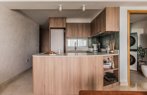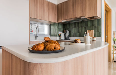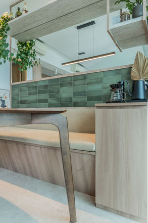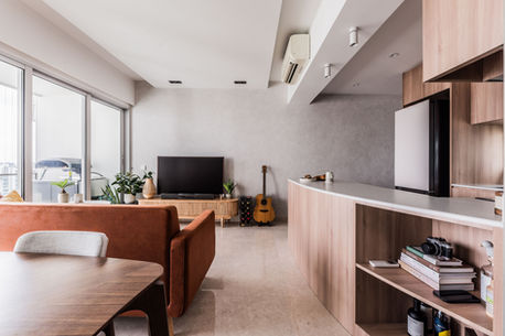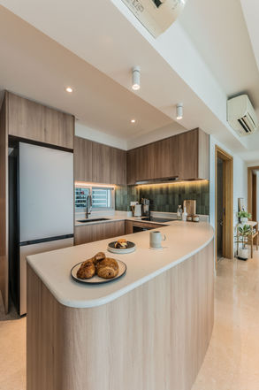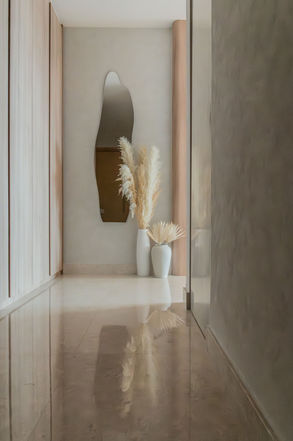 Travertine laminate graces the foyer display cabinet, its intricate patterns mimicking the rugged beauty of natural stone, captivating the eye with its delightful intricacies. Further within, the space unfolds with curved elements that weave fluidity and movement into the design, inviting exploration and discovery.