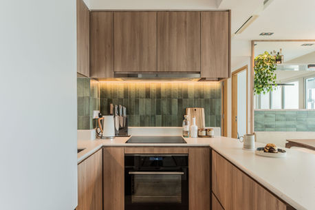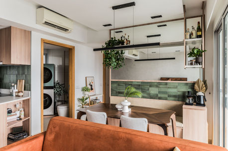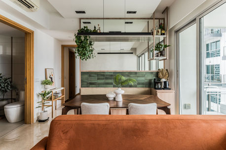 Amidst this natural tapestry sits a burnt orange sofa in the living room, its vibrant hue adding a pop of color and personality to the space. Green subway tiles adorn the walls like vibrant vines, a lively testament to the lush vitality of the outdoors. Their ascent casts a spell of enchantment, beckoning you to immerse yourself in their verdant embrace.