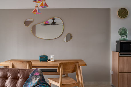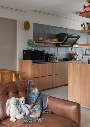 In the kitchen, the key cabinet color is teak wood laminate, exuding warmth and bringing a natural element to the space. The teak wood adds a touch of mid-century charm, complementing the whimsical vibe. The kitchen backsplash features strip-like grey tiles, creating a sleek and modern backdrop that beautifully contrasts with the wooden cabinets.