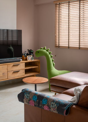 Throughout the home, whimsical touches abound. Playful elements like dinosaur statue, collectibles soft toys, colorful accent pillows, and quirky decor items add personality and charm. Indoor plants with their vibrant green leaves breathe life into the space, creating a fresh and natural ambiance.